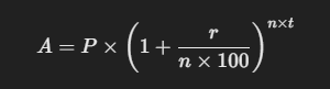 - Formula: A=P×(1+rn×100)n×tA = P \times \left(1 + \frac{r}{n \times 100}\right)^{n \times t}